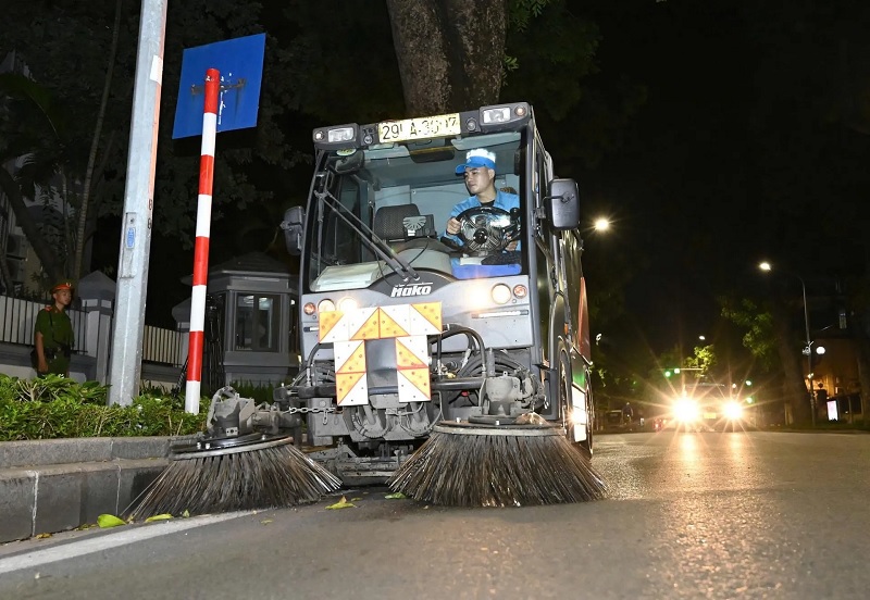 Hình ảnh 4: Xe chuyên dụng quét rác, hút bụi làm sạch các tuyến đường, phố xuyên đêm phục vụ Đại lễ A80.
